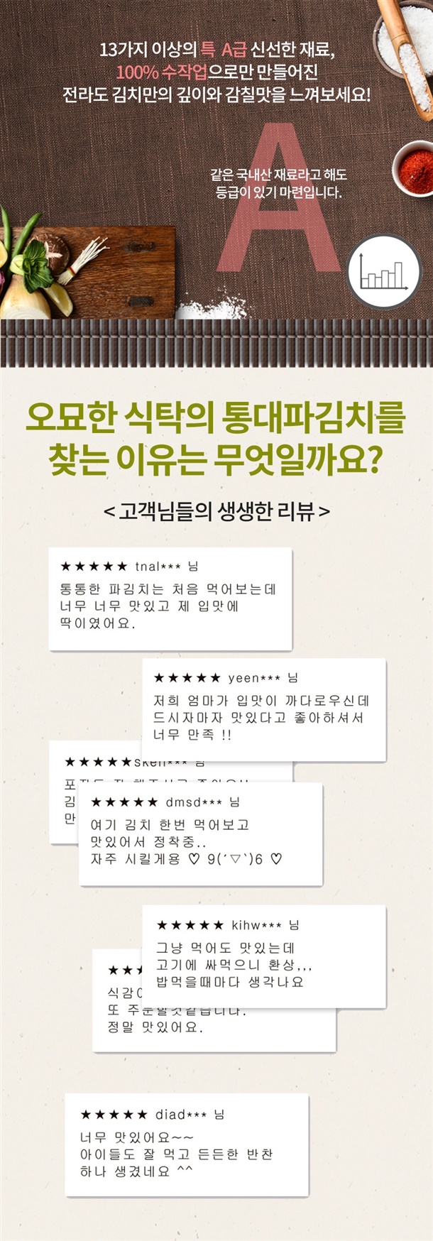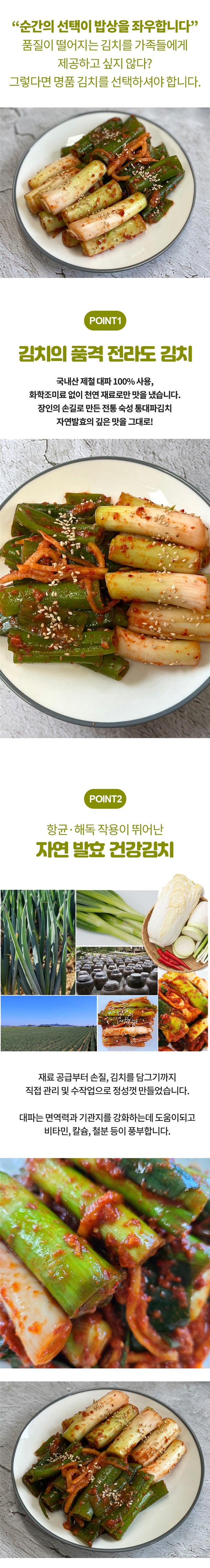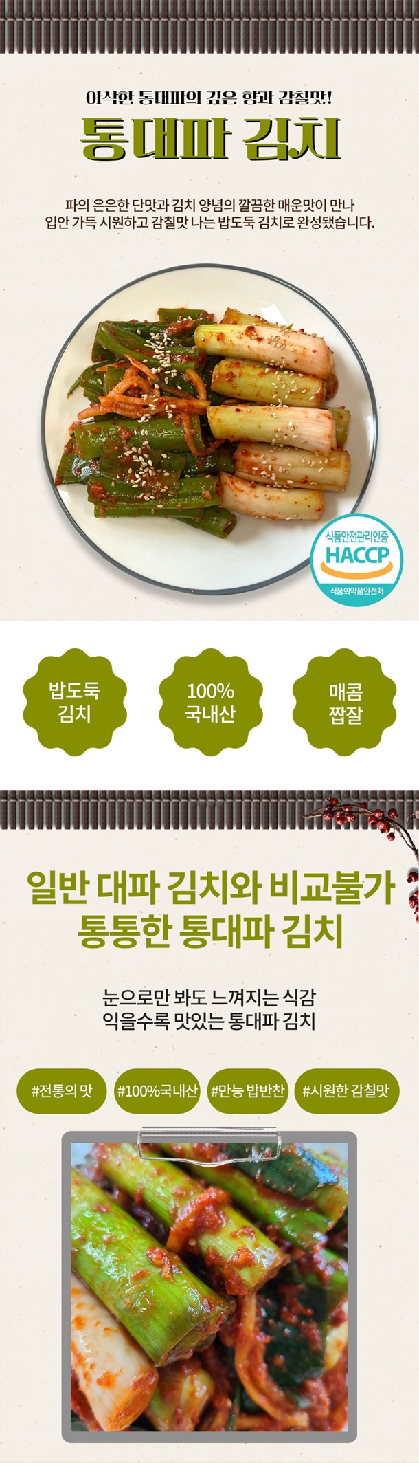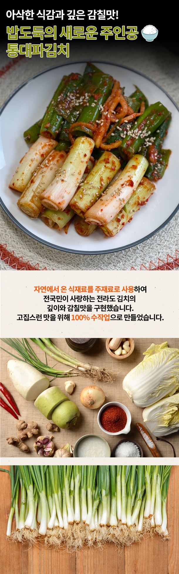 국내산 제철 대파만 엄선해 정성껏 담근 통대파김치입니다. 한 줄기만 잡아도 밥 한 공기 뚝딱!