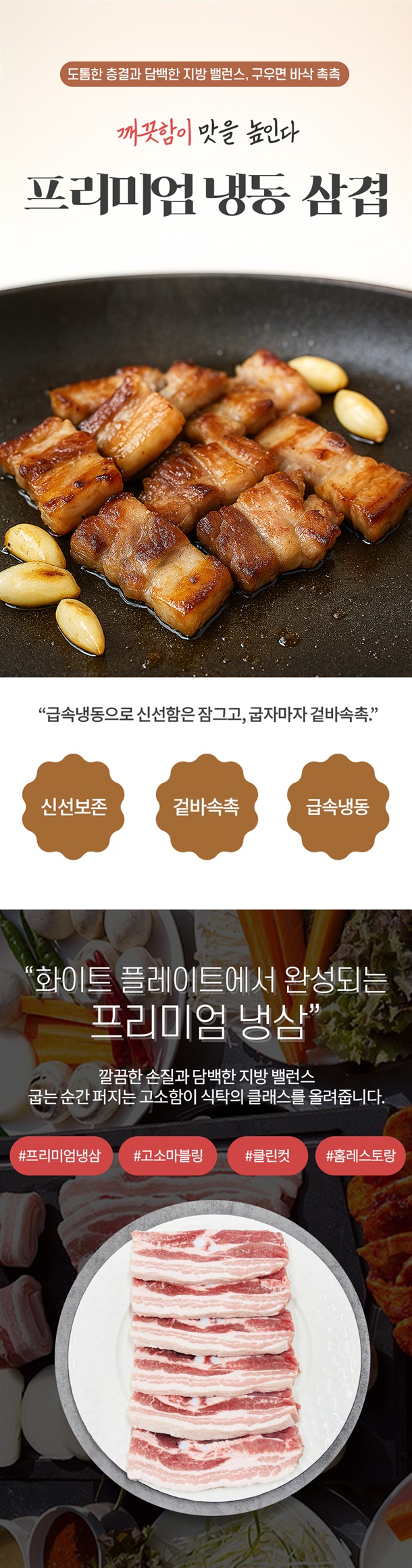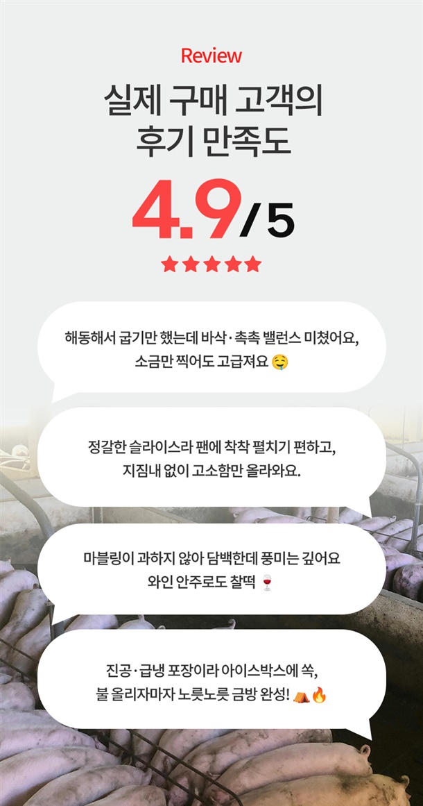 얇고 넓은 컷으로 빨리 노릇해 겉바속촉 식감이 살아나요. 소금·후추만으로도 담백 고소, 쌈장·마늘과 찰떡궁합! 진공포장·급속냉동으로 신선함을 꽉 잠가 집·캠핑 어디서나 실패 없이 한 판 완성