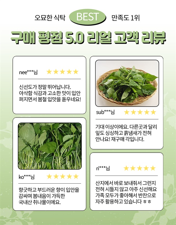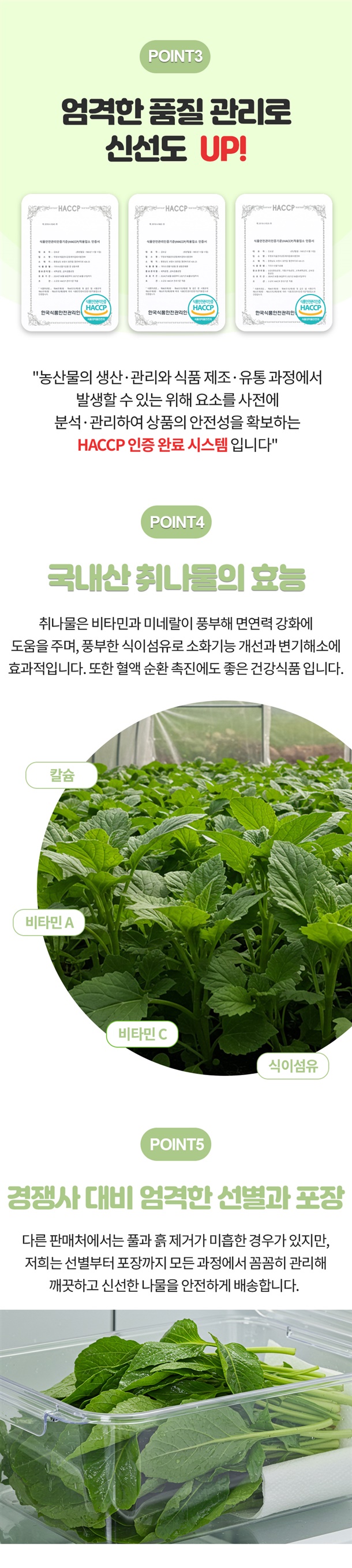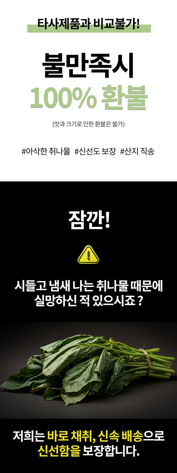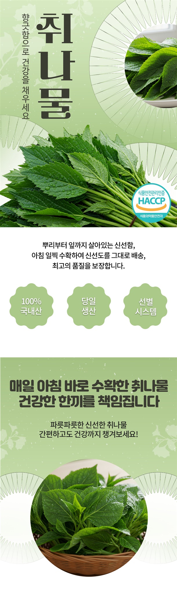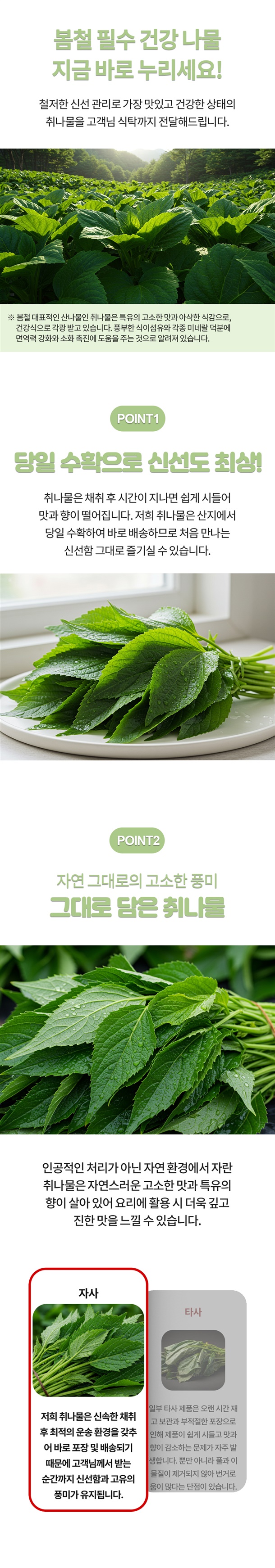 맑은 공기와 깨끗한 물로 자란 신선한 국내산 생 취나물! 한 줄기 한 줄기 정성껏 수확해 향긋한 봄내음을 그대로 담았습니다.