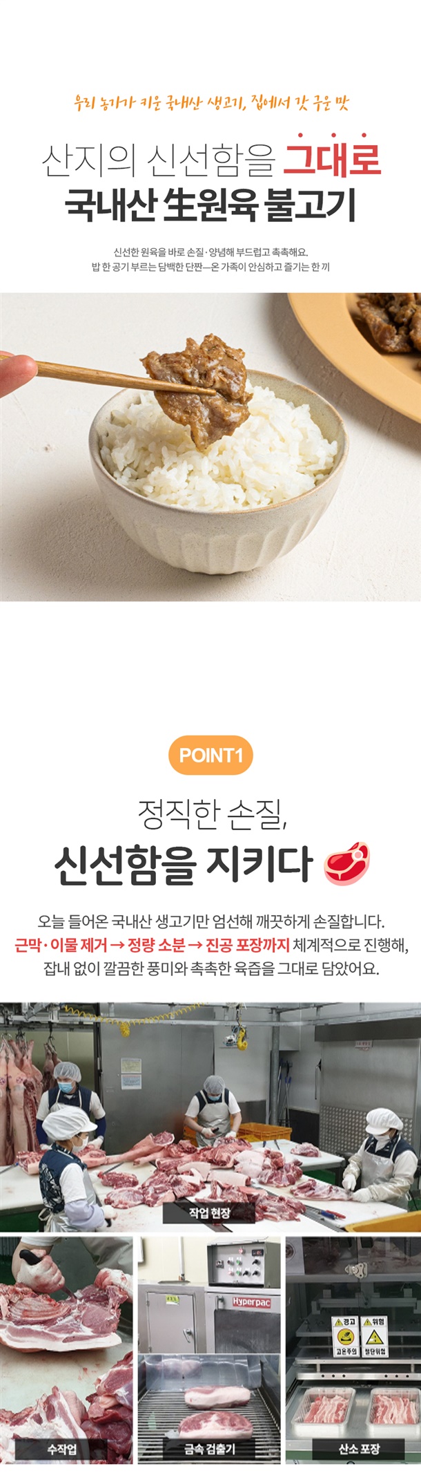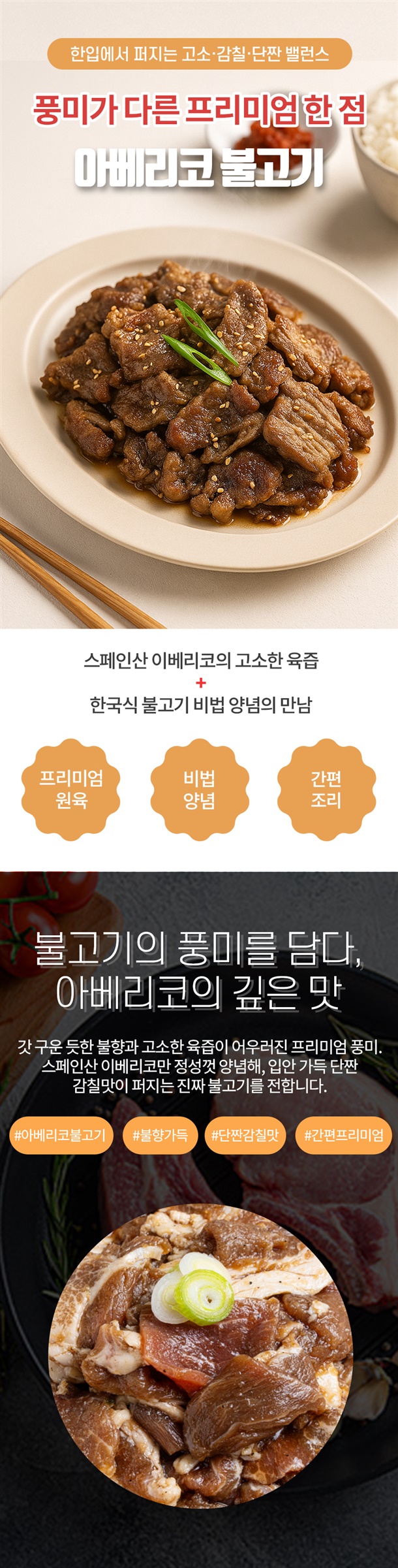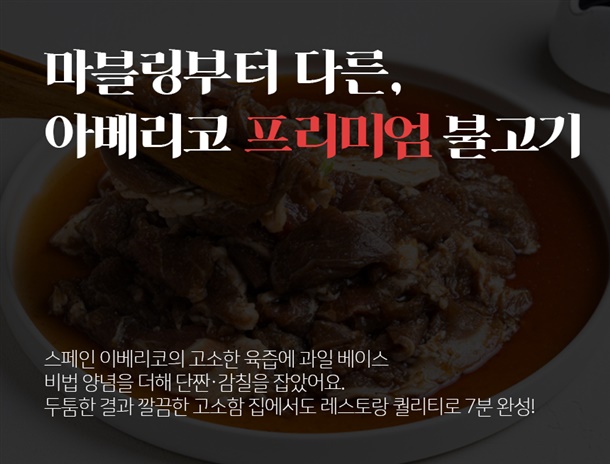 스페인산 이베리코의 고소한 마블링에 과일 베이스 비법 양념을 더해, 집에서도 7분이면 레스토랑 퀄리티로 즐기는 단짠 불고기입니다.