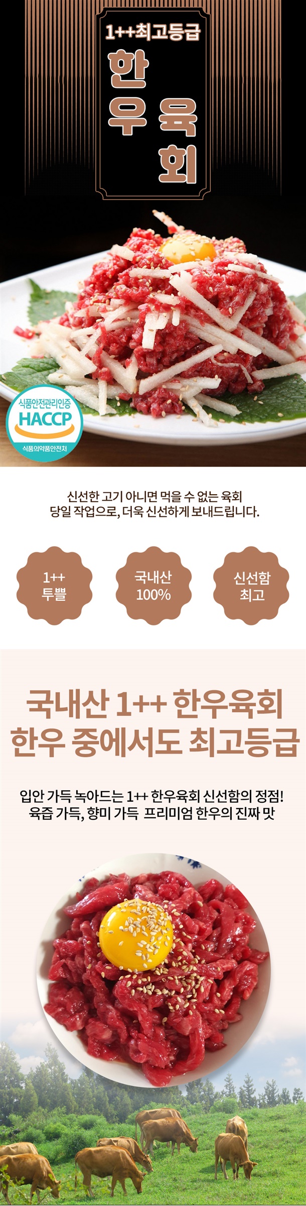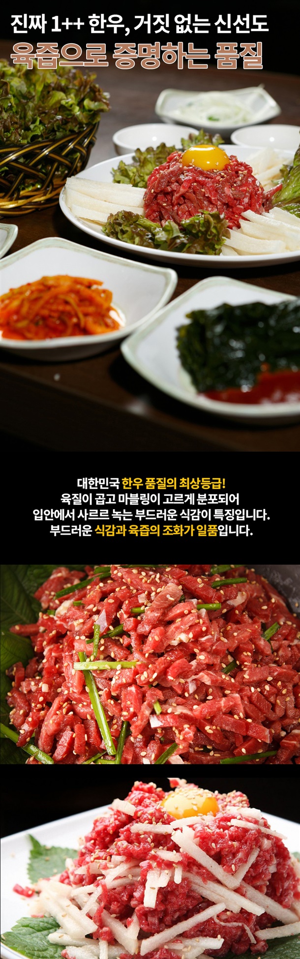 대한민국 한우 품질의 최상등급! 육질이 곱고 마블링이 고르게 분포되어 입안에서 사르르 녹는 부드러운 식감이 특징입니다.